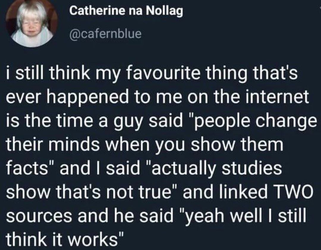About 13 years ago I had a debate with a friend about some political thing. He repeated something from the media (AM radio) I knew was BS so I told him I’d email him evidence to the contrary, he told me he’d send evidence in support. I send him a mountain of evidence but never heard from him. The next time we met I brought it up he told me he didn’t have time to read my email, his body language said otherwise. That’s when I realized it was a cult