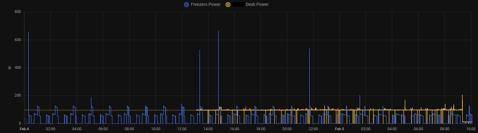 Background: In addition to some other things, I bought two “Eightree” brand Zigbee-compatible plugs to see how they fare. One is monitoring the power usage of both freezers on a power strip (don’t worry, it’s a heavy duty strip meant for this), and the other is measuring the usage of my entire desktop setup (including monitors and the HA server itself, a Lenovo M710q).