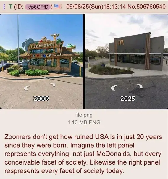 Came to say this. McDonald is not a great allegory on the downfall of the US. The style just changed from colorful cartoon aimed at children to stylish minimalism to attract centrists. The product it’s selling stays the same. It has always been fake. You just grew up.
