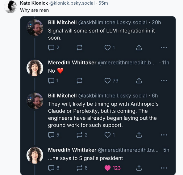 arrow-up1152arrow-down1external-linkGuy explains to CEO of Signal (messaging) that it's going to add "AI" to the service. She says no. He insists, not knowing or caring who he's talking down to.mastodon.socialLemminary@lemmy.world to Confidently Incorrect@lemmy.world · 5 months agomessage-square1fedilinkfile-text