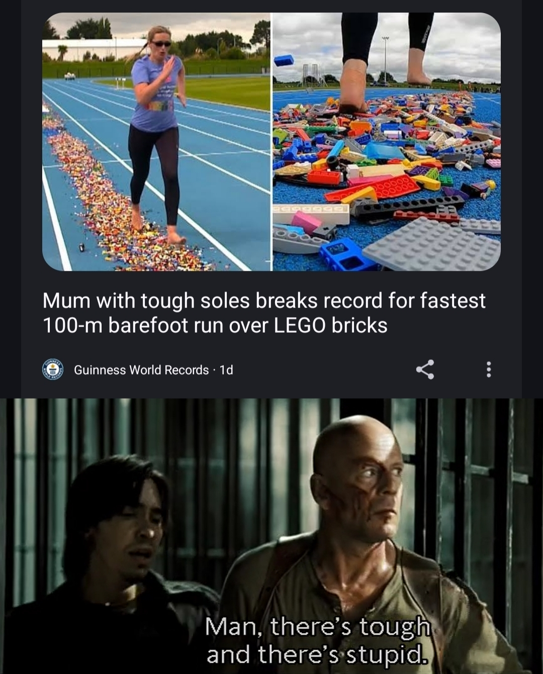 The top picture is a screenshot of an article headline reading “Mum with tough soles breaks world record for fastest 100-m barefoot run over LEGO bricks”. The bottom picture is a screenshot from the movie Live Free or Die Hard, with the caption “Man, there’s tough and there’s stupid.”