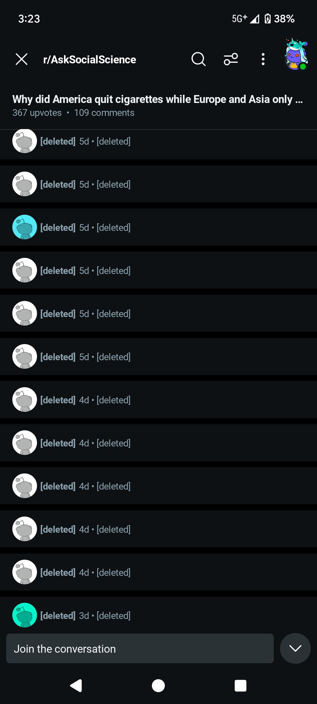 alt text: A screenshot of the reddit app. It is of a sub-reddit called r/AskSocialScience “Why did America quit Cigarettes, while Europe and Asia only …”. A series of deleted replies to the question from 3-4 days ago is shown like: