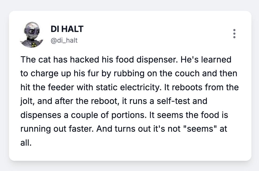 I think there’s a video somewhere where a cat just slightly pull the plug a bit so it disconnected, and release it so it reconnected, and the feeder rebooted and did the thing OOP said.
