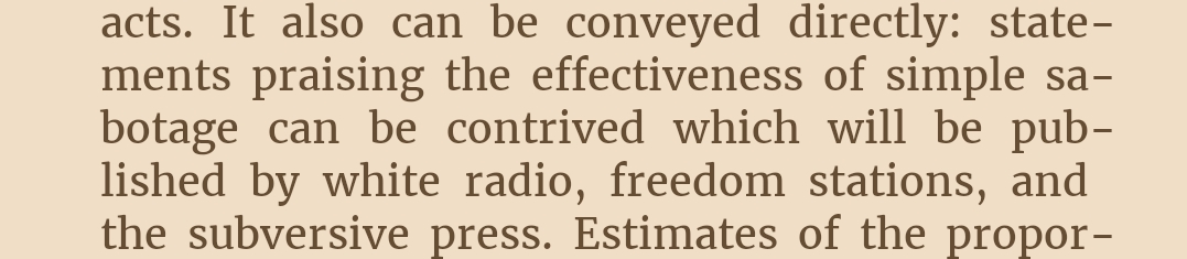 Alt: A screenshot from the book “Simple Sabotage Field Manual” with the text: “It also can be conveyed directly: statements praising the effectiveness of simple sabotage can be contrieved which will be published by white radio, freedem stations, and the subversive press.”