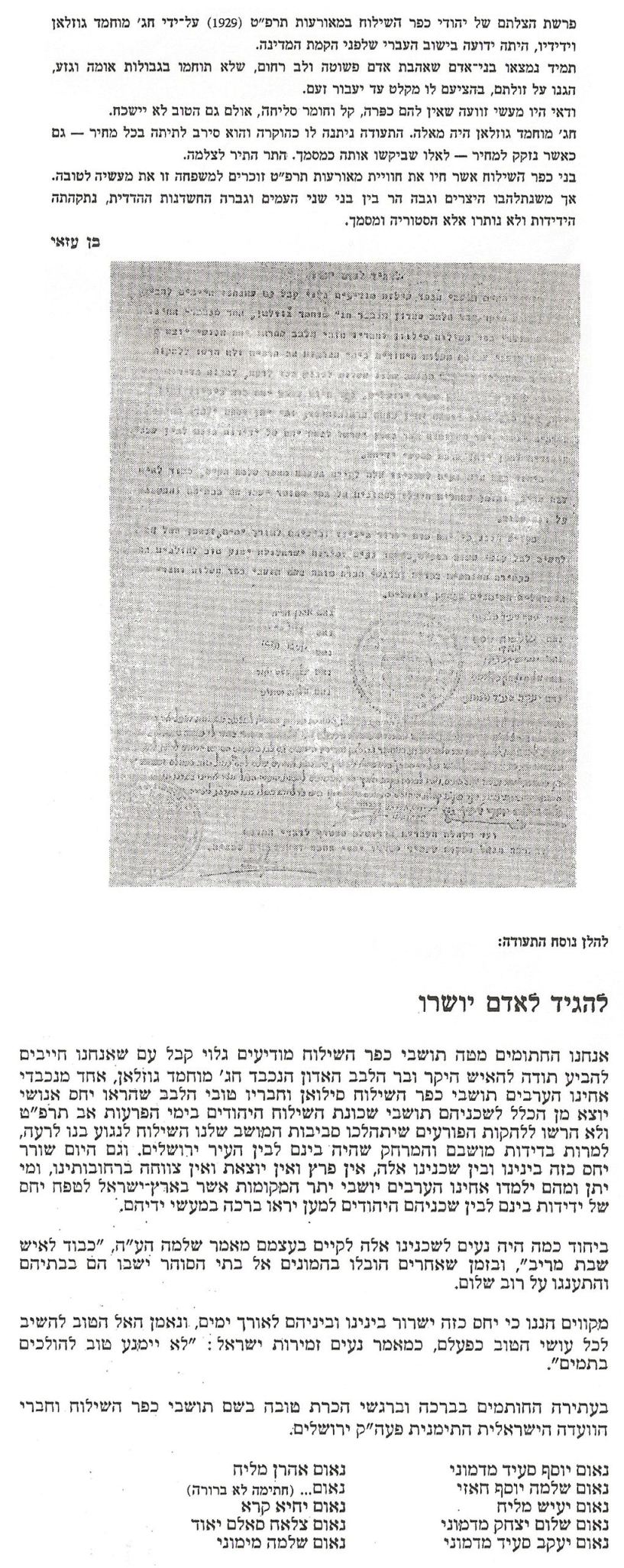 Despite the attempt to depict the 1929 Arab Riot as a violent incident against the Jews in Silwan, it is clear that it was not the case. From a letter of gratitude that the Yemenite Jews sent to their Arab neighbors, we can learn about the devotion and benevolence that the Arabs have shown towards the Yemenites by undauntedly protecting them, and also about the amity and good neighborly relations that prevailed between the two communities.