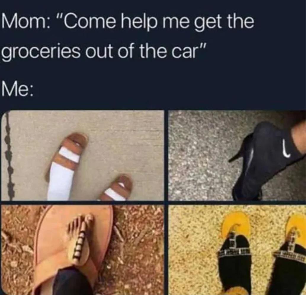 minus-squarefaintwhenfree@lemmus.orglinkfedilinkEnglisharrow-up9·6 days agoOr you cna find your shoes, but they have lace and you will have to un lace,slide your foot, and lace it up before you can be functional, so you just take a random pair of shoes and go out.