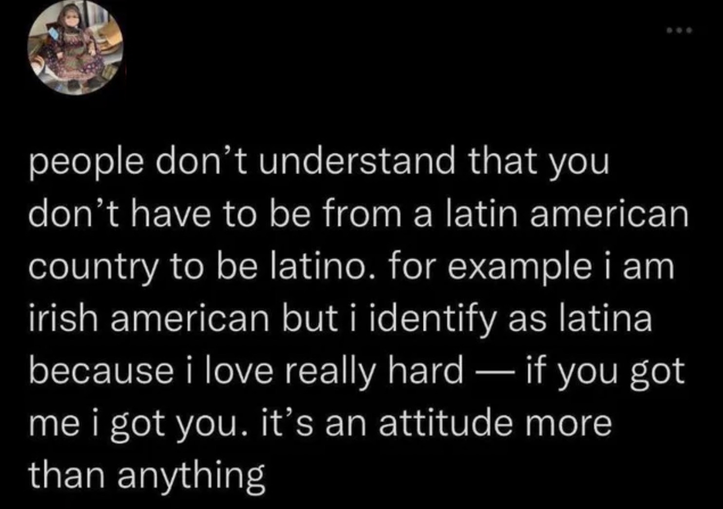 The person in the tweet is American so I used the American census definition. I’m pretty confident any reputable source doesn’t count “loving hard” as a valid reason to identify as Latino.